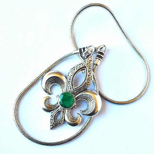 EM-0134- PENDENTIF FLEUR de LYS 50x65 mm avec EMERAUDE facettée 12 mm + CHAÎNE 46 cm Argent 925 - 205 carats - 41 gr