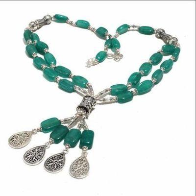 EM-0783 - COLLIER PARURE 2 rangs de perles en EMERAUDE ovales 10x15 mm 4 pendants ROSACES - Ag 925 - 330 carats - 66gr