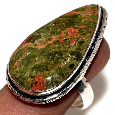 UN-109 - Jolie BAGUE CHEVALIERE T60 en jaspe UNAKITE Rose/verte cabochon amande 18 x 32 mm - Argent 925 - 55 carats - 11 gr