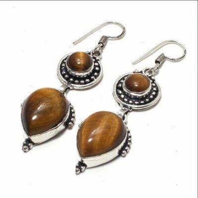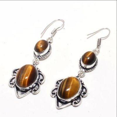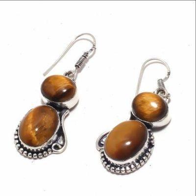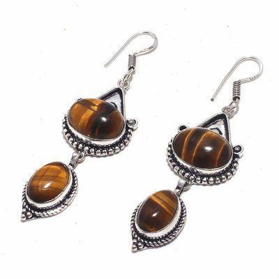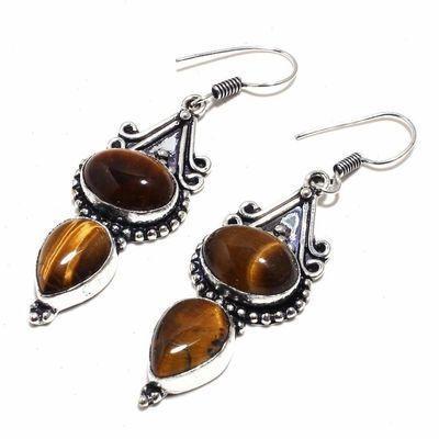 OT-1021 - PARURE : COLLIER + BOUCLES 8 cabochons OEIL DE TIGRE 10 mm - Argent 925 - 27 g 135 carats