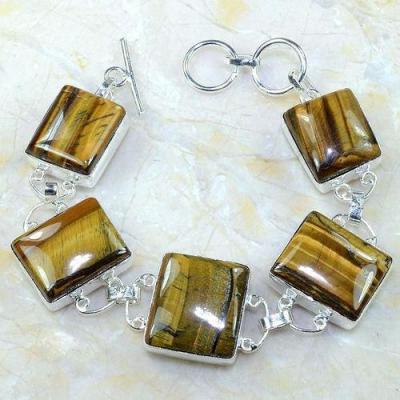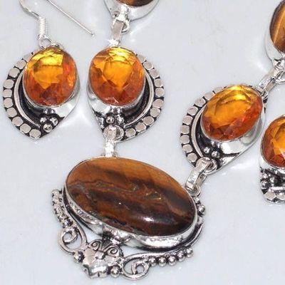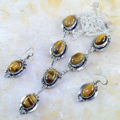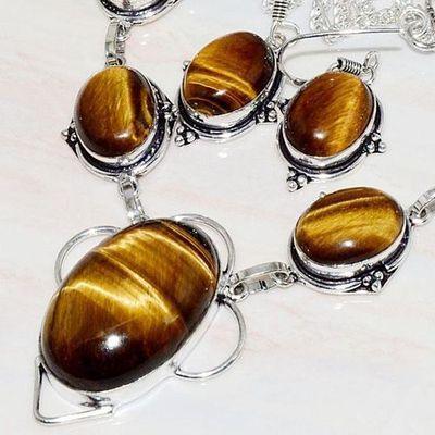 OT-1021 - PARURE : COLLIER + BOUCLES 8 cabochons OEIL DE TIGRE 10 mm - Argent 925 - 27 g 135 carats